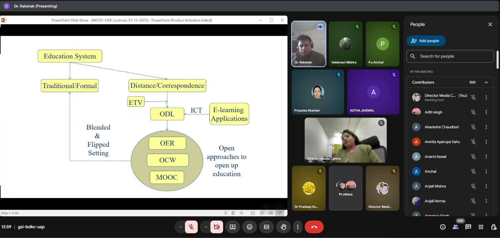 इसके अतिरिक्त डॉ. जैन ने कंटेंट मटेरियल डेवलपमेंट एवं डिलीवरी के अंतर्गत MOOCs कार्यक्रम की संरचना, उसकी कार्यप्रणाली और चरणबद्ध प्रक्रिया की जानकारी दी। उन्होंने संकाय सदस्यों, शोधार्थियों और विद्यार्थियों को कंटेंट क्रिएशन के रचनात्मक तरीकों, प्रभावी प्रस्तुति तथा उससे संबंधित उपयोगी पहलुओं से अवगत कराया तथा यह भी बताया कि किस प्रकार चैटजीपीटी, मैटा जैसे आधुनिक डिजिटल टूल्स का सकारात्मक और सार्थक उपयोग किया जा सकता है। साथ ही उन्होंने ओपन ऑनलाइन कोर्सेज, ओपन कोर्सवेयर, ओपन एजुकेशनल रिसोर्सेज, मल्टीमीडिया आधारित इंटरएक्टिव ट्यूटोरियल्स, वर्चुअल रियलिटी आधारित लर्निंग सिस्टम, वेब आधारित लेक्चर्स और ई-कंटेंट के महत्व पर प्रकाश डाला तथा उपलब्ध ऑनलाइन प्लेटफॉर्म जैसे SWAYAM ऑनलाइन कोर्स, UG/PG MOOCs, ई-पीजी पाठशाला, SWAYAM प्रभा और DTH प्लेटफॉर्म के उपयोग और उनकी उपयोगिता के बारे में विस्तृत जानकारी प्रदान की।