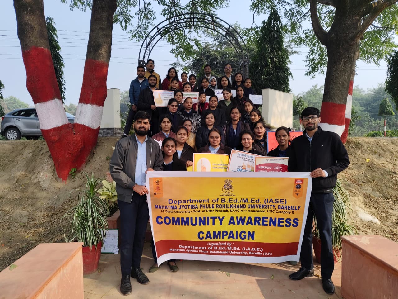 बरेली, 12 दिसम्बर। महात्मा ज्योतिबा फुले रुहेलखण्ड विश्वविद्यालय, बरेली के शिक्षा विभाग में सामुदायिक जागरूकता अभियान का सफलतापूर्वक आयोजन किया गया। यह कार्यक्रम एम एड विद्यार्थियों के पाठ्यक्रम के वैल्यू एडेड प्रोग्राम के तहत एक अनिवार्य गतिविधि होती है जिसमे विद्यार्थी समुदाय के बीच में जाकर अलग अलग मुद्दों पर उनकी राय जानते हैं तथा उनके साथ वार्तालाप करते हैं