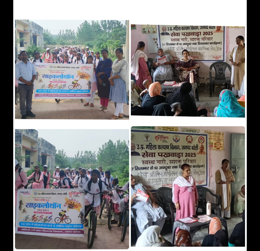 बरेली , 24 सितम्बर। श्री अविनाश सिंह जिलाधिकारी बरेली एवं श्रीमती मोनिका राणा जिला प्रोबेशन अधिकारी बरेली के निर्देशानुसार मिशन शक्ति -5.0 अभियान के अंतर्गत श्रीमती रिंकी सैनी जिला मिशन कोऑर्डिनेटर एवं श्रीमती चंचल गंगवार केंद्र प्रशासक वन स्टॉप सेंटर बरेली के द्वारा राजकीय इंटर कॉलेज वली अहमदपुर जनपद बरेली में साइक्लोथान मेगा इवेंट का आयोजन कराया गया, साइक्लोथान मेगा इवेंट में स्कूल की छात्राओं के द्वारा साइकिल रैली में प्रतिभाग़ किया गयाl प्रतिभागी छात्राओं को महिला कल्याण विभाग की तरफ से बेटी बचाओ बेटी पढ़ाओ की टी-शर्ट, कैप वितरित किए गएl इसके अतिरिक्त श्रीमती हरविंदर कौर एवं श्रीमती शारीन जेंडर स्पेशलिस्ट के द्वारा ब्लॉक बिथरीचैनपुर के ग्राम कुमराह के प्राथमिक विद्यालय में सेवा पखवाड़ा के अंतर्गत जागरूकता कार्यक्रम का आयोजन किया गया। कार्यक्रम में महिला एवं बाल संबंधी कानून एवं कल्याणकारी योजना एवं हेल्पलाइन नंबर के बारे में जानकारी प्रदान की l कार्यक्रम में स्कूल के प्रधानाध्यापक श्रीमती ऊषा, श्रीमती शशि आंगनवाड़ी कार्यकत्री आदि महिलाएं उपस्थित रहीं l बरेली से अखिलेश चन्द्र सक्सेना की रिपोर्ट
