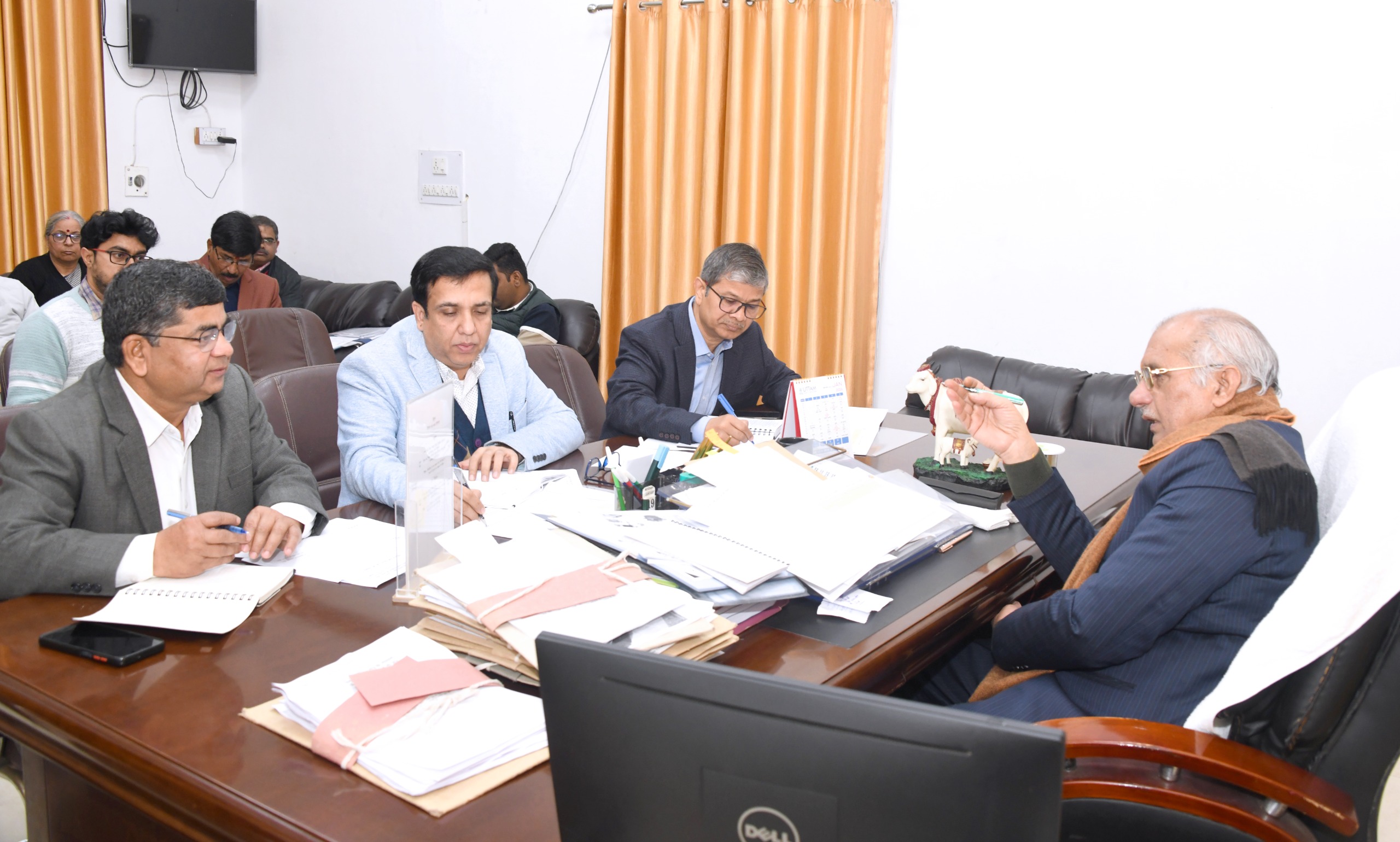 बैठक में पशुधन विभाग के अपर मुख्य सचिव श्री मुकेश मेश्राम ने मंत्री जी को विभाग की योजनाओं की अद्यतन प्रगति से अवगत कराया और आश्वस्त किया कि उनसे प्राप्त दिशा-निर्देशों का अनुपालन सुनिश्चित किया जायेगा। उन्होंने निदेशक, पशुधन को निर्देशित किया कि मण्डलवार प्रतिदिन गौशालाओं की स्थिति की गहन समीक्षा की जाए और उसकी रिपोर्ट शासन को उपलब्ध कराई जाए। गोआश्रय स्थलों पर गौवंश के ठंड से बचाव के साथ ही अन्य आवश्यक सुविधाओं की पर्याप्त व्यवस्था की जाए। अवस्थापना संबंधी कार्यों में गुणवत्ता का पूरा ध्यान रखा जाए।