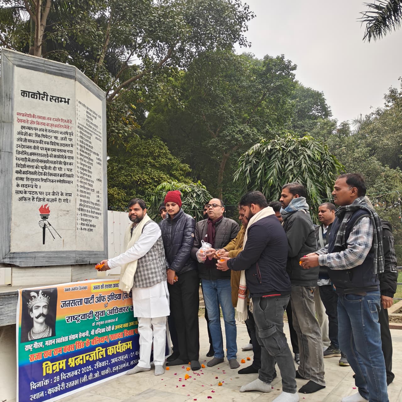 राष्ट्रवादी युवा अधिकार मंच (एन. वाई.आर.एम) एवं जनसत्ता पार्टी ऑफ इंडिया (जे.पी.आई) के संयुक्त तत्वाधान में काकोरी स्तंभ (जी.पी.ओ पार्क) हजरतगंज, लखनऊ में 1857 की क्रांति में महत्वपूर्ण भूमिका निभाने वाले राष्ट्र गौरव,महान स्वतंत्रता संग्राम सेनानी,भारत माँ के वीर सपूत एवं माँ चंद्रिका देवी के अनन्य भक्त अमर शहीद राजा राव राम बक्श सिंह के बलिदान/शहादत दिवस पर पुष्पांजलि कार्यक्रम का आयोजन किया गया l कार्यक्रम की अध्यक्षता करते हुए राष्ट्रीय अध्यक्ष शशांक शेखर सिंह पुष्कर ने कहा कि जनपद उन्नाव कलम व क्रांति की धरती रही है क्रांतिकारियों का सिरमौर रहा है