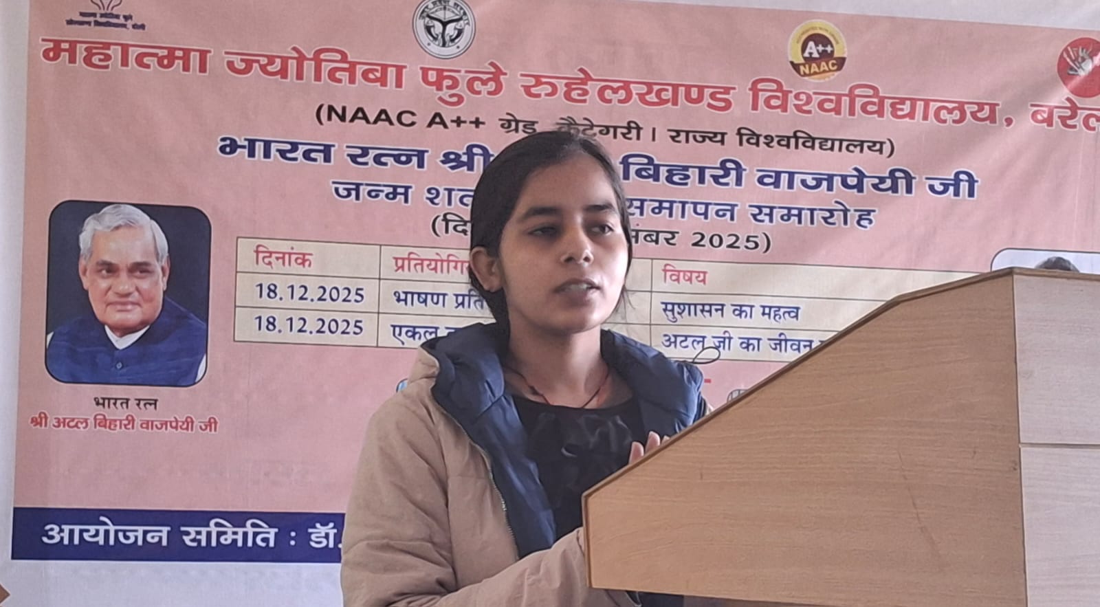 बरेली, 23 दिसम्बर। भारत रत्न श्री अटल बिहारी वाजपेयी जी की जयन्ती / जन्म शताब्दी वर्ष के समापन के अवसर पर उत्तर प्रदेश सरकार के निर्देशानुसार आयोजित जनपद स्तरीय प्रतियोगिता की श्रृंखला में कल वी.आर.एल.आर. महिला महाविद्यालय में भाषण एवं एकल काव्य पाठ प्रस्तुति प्रतियोगिता का आयोजन किया गया। जिसका विषय अटल जी एवं उनका सुशासन रखा गया। महात्मा ज्योतिबा फुले रुहेलखण्ड विश्वविद्यालय बरेली के विश्वविद्यालय सांस्कृतिक केंद्र की दो छात्राओं ने इसमें प्रतिभाग किया।भाषण प्रतियोगिता में लवी सिंह ने प्रतिभाग करते हुए अटल जी की सुशासन नीतियों की तथ्यात्मक प्रस्तुति देकर तृतीय स्थान प्राप्त किया वहीं सौम्या गंगवार ने एकल काव्य पाठ प्रस्तुति प्रतियोगिता में प्रतिभाग कर अटल जी पर स्वरचित कविता सुना कर तृतीय पुरुस्कार अपने नाम किया । दोनों विद्यार्थियों की रचनात्मक और तथ्यात्मक प्रस्तुति पर निर्णायक मंडल ने भूरि भूरि प्रशंसा भी की। दोनों ही विजयी छात्राओं को 25 दिसम्बर 2025 को उत्तर प्रदेश शासन के द्वारा बरेली जिले में आयोजित पुरस्कार वितरण कार्यक्रम में बरेली प्रशासन के अधिकारियों एवं जनप्रतिनिधियों द्वारा सर्टिफिकेट एवं पुरस्कार धनराशि देकर सम्मानित किया जाएगा। दोनों छात्राओं के शानदार प्रदर्शन पर विश्वविद्यालय के कुलपति प्रो. के.पी. सिंह ने शुभकामनाएं प्रेषित कर आशीर्वाद दिया एवं कहा कि सांस्कृतिक केंद्र के युवाओं का प्रदर्शन शानदार और बेहतरीन प्रदर्शन रहा और यह विश्वविद्यालय के लिए गौरव की बात है। सांस्कृतिक केंद्र समन्वयक डॉ. ज्योति पांडेय ने कहा कि साहित्यिक और रचनात्मक गतिविधियों में कल्चरल क्लब बेहतर गुणात्मक प्रदर्शन कर रहा है। लवी सिंह साहित्यिक समिति की समन्वयक भी है और सौम्या कविता लेखन समिति की सदस्य है। दोनों विजेता विद्यार्थियों को कुलसचिव श्री हरीश चंद, सांस्कृतिक समन्वयक डॉ.ज्योति पाण्डेय,परीक्षा नियंत्रक संजीव कुमार सिंह, डॉ. सौरभ ,डॉ. इंद्रप्रीत , डॉ रीना सहित शिक्षकों एवं विश्वविद्यालय प्रशासन , कल्चरल क्लब ने बधाई और शुभकामनाएं भी प्रदान की ।