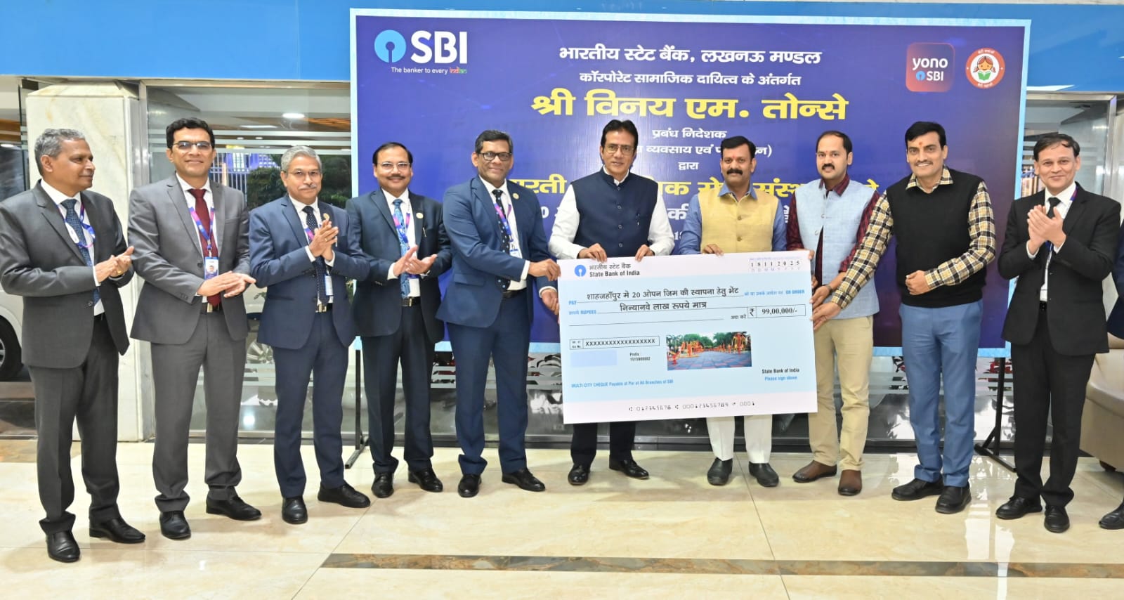 दिनांक 18.11.2025 को भारतीय स्टेट बैंक के प्रबंध निदेशक श्री विनय एम. तोन्से ने लखनऊ मण्डल के अपने दौरे में मेसर्स भारती सामाजिक सेवा संस्थान (एनजीओ) को बैंक के कॉर्पोरेट सामाजिक दायित्व कार्यक्रम के अंतर्गत शाहजहांपुर जिले में 20 ओपन जिम स्थापित करने के लिए 99 लाख रुपये का चेक भेंट किया। भारतीय स्टेट बैंक की इस पहल का उद्देश्य समुदाय में स्वास्थ्य और आरोग्य को बढ़ावा देना है।