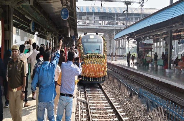 वाराणसी: प्रधानमंत्री नरेन्द्र मोदी ने भारत की आधुनिक रेल अवसंरचना के विस्तार की दिशा में एक महत्वपूर्ण कदम के तहत वाराणसी में चार नयी ‘वंदे भारत एक्सप्रेस’ ट्रेन को हरी झंडी दिखाकर रवाना किया। अपने संसदीय क्षेत्र वाराणसी के दो दिवसीय दौरे के दूसरे एवं अंतिम दिन मोदी ने बनारस रेलवे स्‍टेशन पर चार नयी वंदे भारत एक्सप्रेस ट्रेन को हरी झंडी दिखाकर रवाना किया। ये नयी ट्रेन बनारस-खजुराहो, लखनऊ-सहारनपुर, फिरोजपुर-दिल्ली और एर्नाकुलम-बेंगलुरु मार्गों पर चलेंगी।