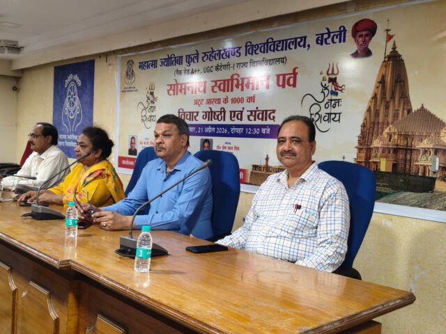 बरेली,23 अप्रैल। महात्मा ज्योतिबा फुले रुहेलखण्ड विश्वविद्यालय के शिक्षा विभाग में माननीय कुलपति प्रोफेसर के. पी. सिंह जी के सान्निध्य, मार्गदर्शन एवं प्रेरणा से “सोमनाथ स्वाभिमान पर्व” के उपलक्ष्य में एक विचार गोष्ठी एवं संवाद कार्यक्रम का आयोजन किया गया। यह कार्यक्रम सांस्कृतिक गौरव, आध्यात्मिक चेतना एवं शैक्षिक जागरूकता के संगम के रूप में सफलतापूर्वक संपन्न हुआ।