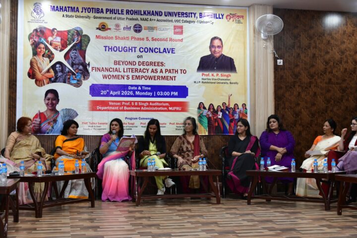 बरेली,21अप्रैल। महात्मा ज्योतिबा फुले रुहेलखण्ड विश्वविद्यालय के प्रबंधन विभाग स्थित प्रो. एस. बी. सिंह ऑडिटोरियम में कल “शैक्षणिक उपाधियों से आगे: वित्तीय साक्षरता के माध्यम से महिला सशक्तिकरण” विषय पर एक भव्य विचार मंच (थॉट कॉन्क्लेव) का आयोजन किया गया। कार्यक्रम के मुख्य संरक्षक कुलपति प्रो. के. पी. सिंह रहे।