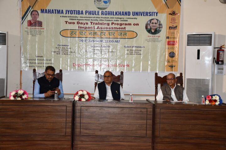 बरेली,27फरवरी।महात्मा ज्योतिबा फुले रुहेलखण्ड विश्वविद्यालय के समाज कार्य विभाग द्वारा जल जीवन मिशन की “हर घर नल – हर घर जल” योजना के प्रभावी मूल्यांकन हेतु दो दिवसीय प्रशिक्षण कार्यक्रम का विश्वविद्यालय के कुलपति प्रोफेसर केपी सिंह की अध्यक्षता में कल सफलतापूर्वक उद्घाटन किया गया। इस प्रशिक्षण का उद्देश्य विद्यार्थियों को चयनित ग्रामीण क्षेत्रों में संचालित योजना के सामाजिक, आर्थिक एवं स्वास्थ्य संबंधी प्रभावों का वैज्ञानिक मूल्यांकन करने के लिए तैयार करना था।