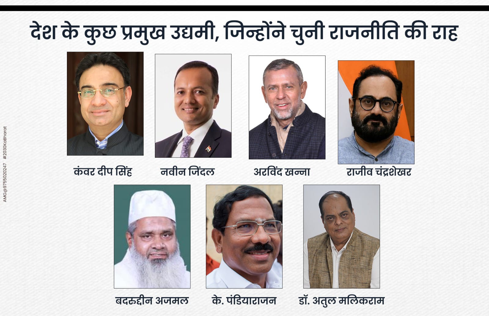 उत्तर प्रदेश की राजनीति में कंवर दीप सिंह (के.डी. सिंह) इसका एक बड़ा उदाहरण रहे। लखनऊ के प्रतिष्ठित केडी सिंह बाबू स्टेडियम से लेकर बड़े व्यावसायिक घरानों तक अपनी पहचान बनाने वाले सिंह ने समाजवादी पार्टी के जरिए सत्ता के गलियारों में अपनी धाक जमाई। उन्होंने विधान परिषद सदस्य के तौर पर औद्योगिक नीतियों में व्यापारिक दृष्टिकोण को शामिल करने की पुरजोर वकालत की। वहीं देश के दिग्गज उद्योगपति नवीन जिंदल का नाम इस सूची में प्रमुखता से आता है। जिंदल स्टील एंड पावर के शिखर से राजनीति के मैदान तक का उनका सफर प्रेरणादायक भी है और चुनौतीपूर्ण भी। कांग्रेस से लेकर भाजपा तक के अपने सफर में उन्होंने ऊर्जा और इन्फ्रास्ट्रक्चर जैसे विषयों पर संसद में जो स्पष्टता दिखाई, वह एक विशुद्ध राजनीतिज्ञ के पास कम ही मिलती है।