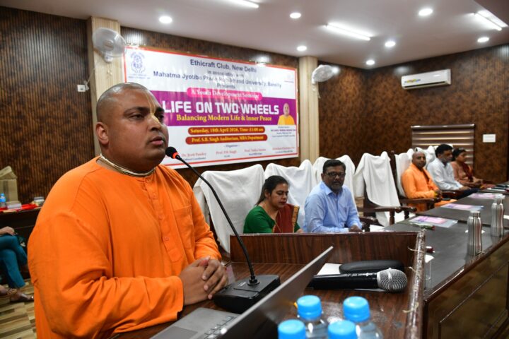 बरेली,19अप्रैल। महात्मा ज्योतिबा फुले रूहेलखण्ड विश्वविद्यालय बरेली में कल युवाओं हेतु अभिप्रेरक सेमिनार का आयोजन किया गया, जिसका विषय लाइफ ऑन टू व्हील्स: बैलेंसिंग मॉडर्न लाइफ एंड इनर पीस रहा। सेमिनार का आयोजन एथीक्राफ्ट संस्था, नई दिल्ली तथा महात्मा ज्योतिबा फुले रूहेलखण्ड विश्वविद्यालय बरेली के संयुक्त तत्वाधान में किया गया था जिसका आयोजन डीन स्टूडेंट वेलफेयर प्रो. पी.बी.सिंह तथा सांस्कृतिक समन्वयक डॉ. ज्योति पाण्डेय द्वारा किया गया। कार्यक्रम के अध्यक्ष माननीय कुलपति प्रो. के.पी. सिंह जी रहे।